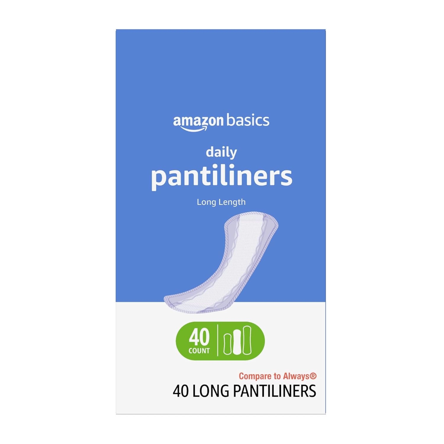 Amazon Basics Daily Pantiliner, Long Length, Feminine Pads for Women, Unscented, Leakage Protection, 40 Count (Previously Solimo)