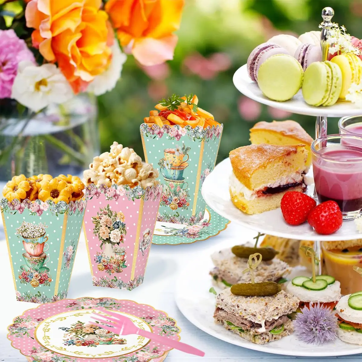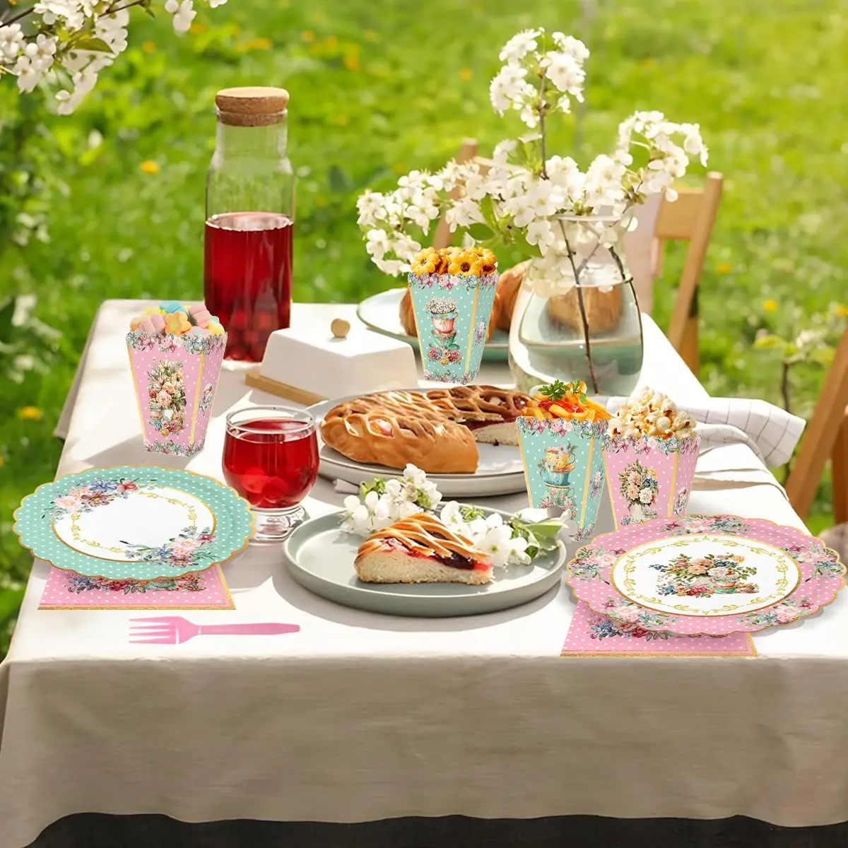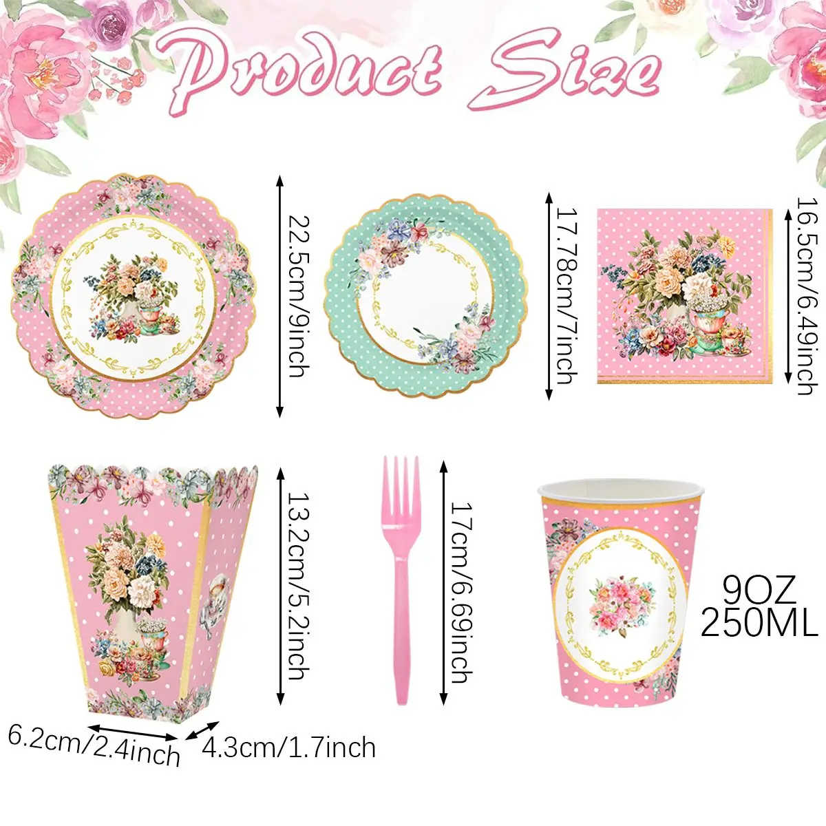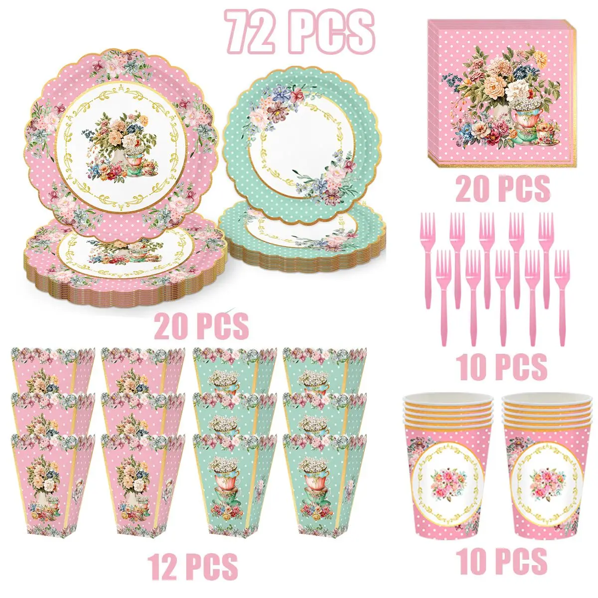 Floral Dinnerware Set for Tea Party 72 Pcs Disposable Tableware 10 Paper Cups 20 Saucers Plates 20 Napkins 12 Decorations