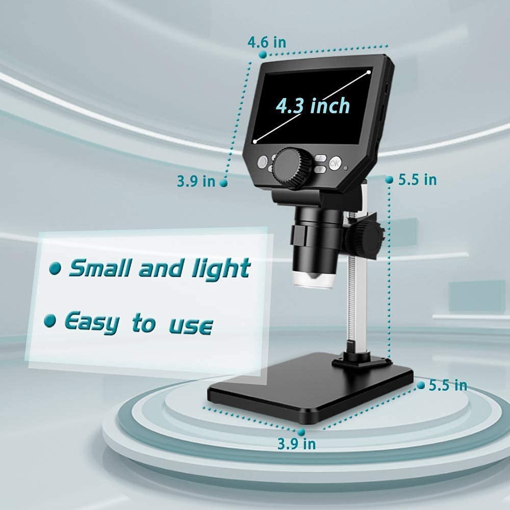 - 【4.3 INCH LCD DIGITAL MICROSCOPE , HIGH DEFINITION, CONVENIENT FOCUSING 】: Electronics microscope has 1000 times magnification and 1080p / 720p resolution. microscope with usb, Adjust the object to the lens and slowly turn the focusing wheel to see the fine details. It is very convenient. It has a built-in rechargeable lithium battery, which can work for 4-5 hours. It is portable and independent. It has enough power for outdoor observation and can be used by hand without the bracket.