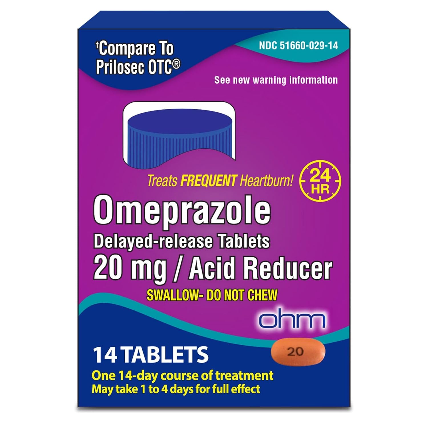 Ohm Omeprazole 20mg, 14 Delayed-Release Tablets (2 Weeks Supply) Acid Reducer for Frequent Heartburn, 24-Hour Relief, Heartburn Medicine to Help Relieve Stomach & Chest Discomfort