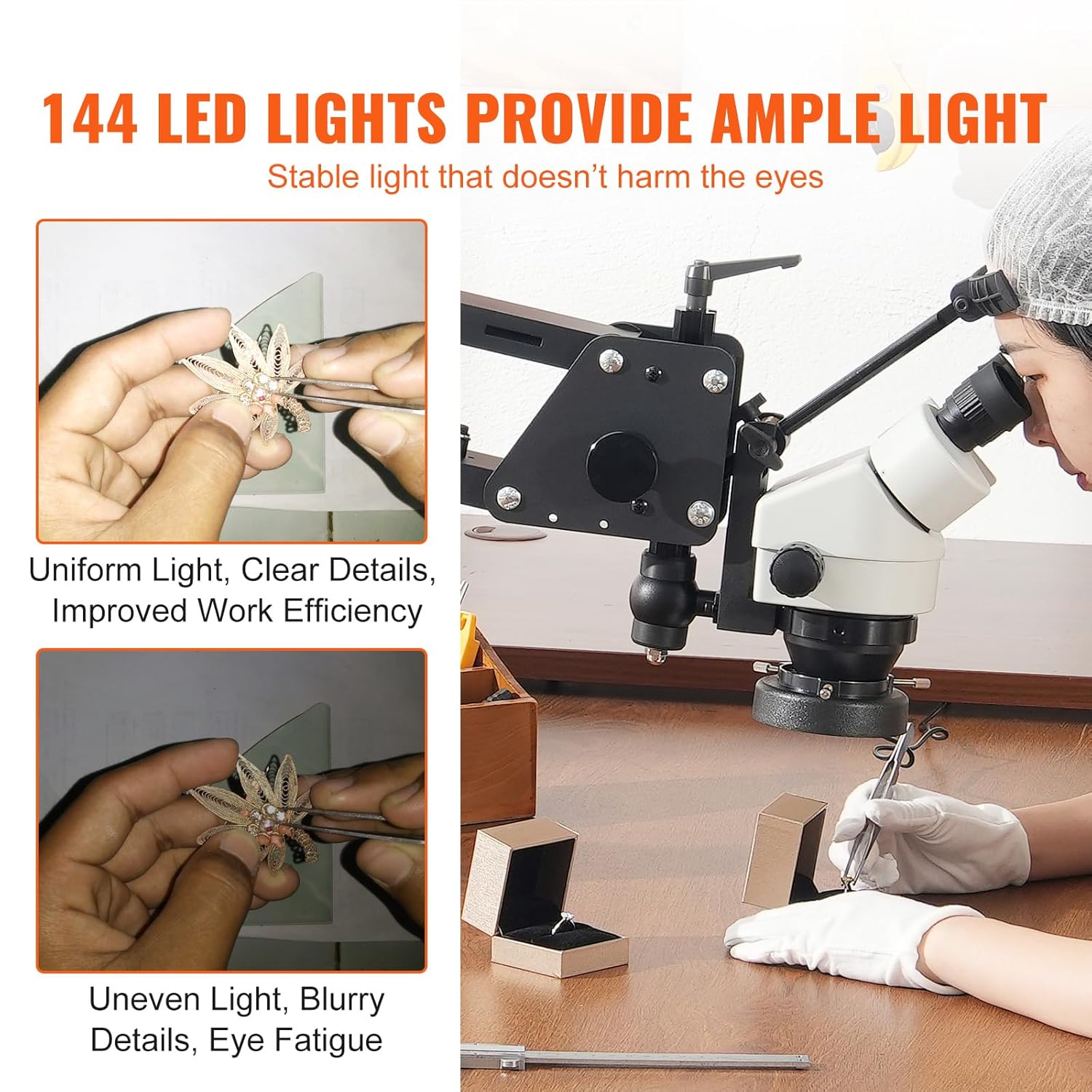 - 7X-45X Continuous Zoom: This spring-mounted jewelry microscope gives you high definition and a wide field of view for your work. The operating height is 0-15.7 inches /0-400 mm, the field of view is 0.2-1.3 inches /5.1-33 mm, and the lens ring is 3 inches /77 mm, providing high definition and powerful stereoscopic effects.