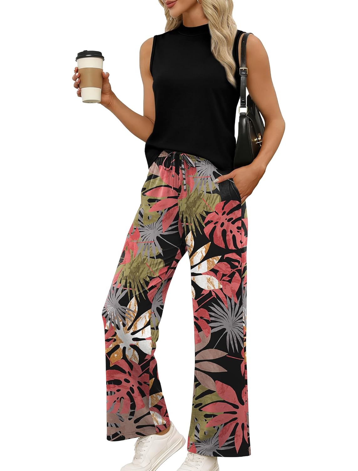 - Feature:Mock neck sleeveless top with contoured back for flattering fit,Cropped Length,Wide-leg printed pants with elastic drawstring waist,Regular fit designed for adult women,Utility pocket for small essentials: