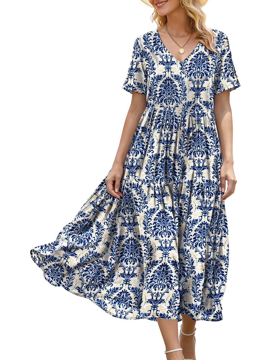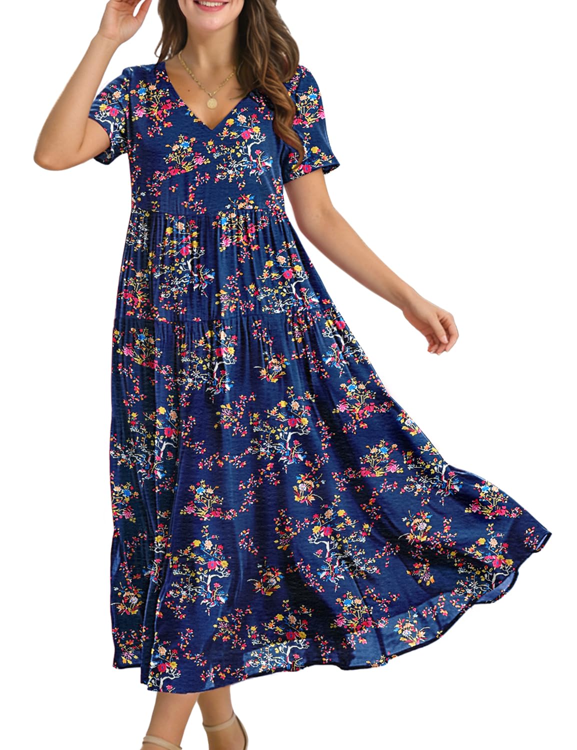 YESNO Women’s Summer Maxi Dresses Casual Floral Short Sleeve V Neck Boho Beach Vacation Swing Dress with Pockets EVF